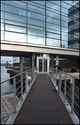 Hovedindgangen kommer man til via broen over til dokøen. Herfra forbindelse til vindeltrappe og elevator op til gangbroen.