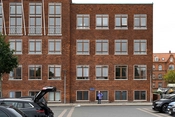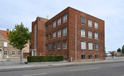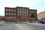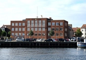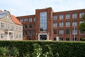 Den 3 etages høje bygningskrop med fladt tag er symmetrisk opbygget omkring centralrummene - trapperummet i indgangsfacaden og byrådssalen i bygningens hovedfacade mod havnen.