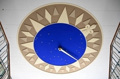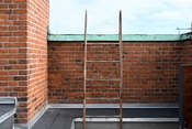 Byvåbnet er placeret øverst oppe midt på murværket over byrådsalen. Helt oppe på det flade tag den store flagstang.