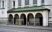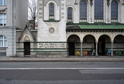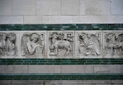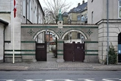 Facaden er beklædt med sandsten, hvori der er indfældet bånd af grønglaserede tegl. Derudover er facaden udmykket med relieffer og skulpturer af Th. Bærentzen.