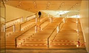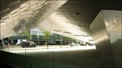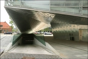 Bygningen fremstår let og svævende og hviler kun på tre punkter. Der er otte meter fra på pladsen op til undersiden af bygningens spids.