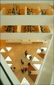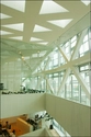 Indvendigt er bygningen bygget omkring to trekantede atrier, der bringer lys og luft ned i huset.