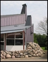 Den lilla træbeklædning, zinktage og store kampesten præger husets fremtoning.