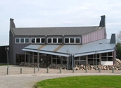 Bygningens gavl domineres af ventilationsskorstene og runde marksten.