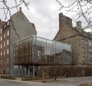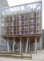 På et hjørne ved Jemtelandsgade står det nye mødelokale som en glaskrystal på et bundt skrå betonsøjler og vidner om kvarterets aktiviteter.