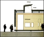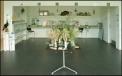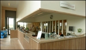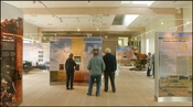 Centeret deles på midten af en stort glasparti der adskiller udstillingsrummene og cafeteriaet.