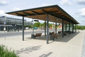 Ventesalene til stationen står som to fritstående pavilloner og er opført i glas og stål. Den største pavillon har et svævende træbeklædt tag hvorunder der er opsat bænke.