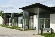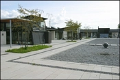 Den renoverede hovedindgang til ældrecentret er markeret med et udkraget tag båret af stålsøjler.