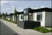 Mod øst består centeret af en hesteskoformet kæde af rækkehuse som omkranser et fælles gårdanlæg.