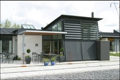 Kanap med udendørs opholdsplads og facade med solafskærmede jalousier - orienteret mod det fælles gårdrum.