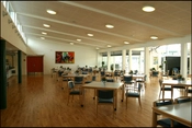 Plejehjemmets spisestue er forsynet med et højtsiddende vinduesbånd og orienteret mod det fælles gårdrum.