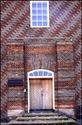 På husets bagside er den rustikke hoveddør med kraftige nagler flankeret af vandret mønstermurværk i stil med skorstenens.