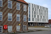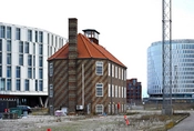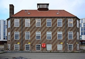 På gavlen mod byen står Lodsstationens store skorsten, der ligesom facaderne er opmuret som mønstermurværk.