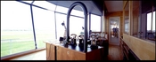 Interiør fra flyvelederkarnappen med det oprindelige kontrolpanel af messing som viser klokken, vindhastighed og barometerstand.