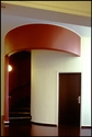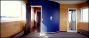 I kortrummet på tagetagen lander den cylindriske spindeltrappe. Trappen er udvendig farvesat som blå, mens væggene er beklædt med Junckerparket - for at kunne demonteres ved installationsændringer.