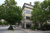 Den funktionalistiske boligbebyggelse i gule mursten fremstår lys og klart geometrisk med rektangulære karnapper og murfremspring. Facaderne er brudt af karnapper, altaner og vandrette bånd af brune teglsten der omslutter de grønmalede vinduer.