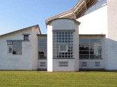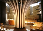 Sollyset strømmer ind i lokalet fra de højtsiddende vinduer.
