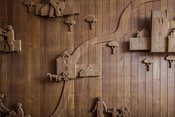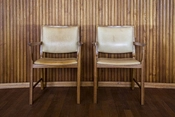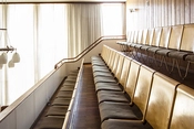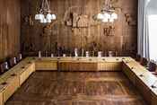 I mødesalen er gulvet og vægbeklædningen af teaktræ. Hele den 60 m2 store nordvæg er udsmykket med træskærerarbejde udført af billedhuggeren Frantz V. Hansen.