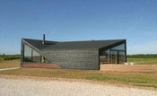 Husets, der er opført af betonelementer, er beklædt med sortmalet træ. Den mørke farve fortsætter på taget, der er dækket af tagpap.