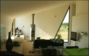Et stort, trekantet vinduesparti i husets ene ende fortsætter helt op til loftets kip.