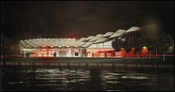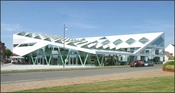 Det store, svævende tag er en stålkonstruktion, som består af store kryds, der er boltet sammen og derpå brandisoleret, varmeisoleret og akustisk dæmpet. Taget er fremstillet i Letland.