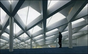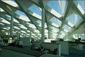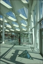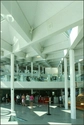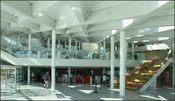 Bygningens fire etager og det indre torv er visuelt sammenhængende og slanke, hvide søjler bærer den store loftskonstruktion i stål og glas.
