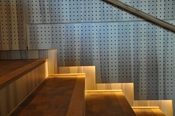 Belysning af auditoriets lange trappe beklædt med egetræsparket