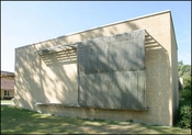 Bygningens gavl er domineret af en stor bevægelig solafskærmning.