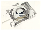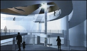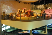 Adskillelsen mellem udstillingen og de rum, som omkranser den, er formet som en række forskudte skaller. Her krydser man ind og ud af hovedudstillingen og bevæger sig på ramper, trapper og gangbroer.