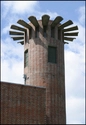 I kirkens nordøstlige hjørne er der et rundt klokketårn med en markant afskærmning i toppen, der stikker ud som kronbladene på en blomst. Kirkens indgang ligger i et glasparti under tårnet, mellem kirkebygningen og komplekset mod sydøst.