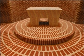 De røde teglsten dominerer også indvendigt hvor alt inventar er udført i lyst træ.