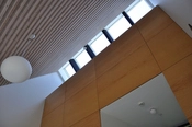 Kig på vægge i det høje værelsesrum på førstesalen, hvor lamelbetrædte træbetonflader bidrager til at danne god akustik.