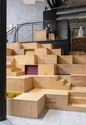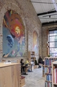 Store nye velux vinduer lukker lys ned i det store rum. Der er indrettet studiepladser ovenpå den sorte kasse der indeholder toiletter og opbevaringsrum. De 4 meter høje malerier i gamle vinduesnicher er udsmykket med malerier af Eske Kath.
