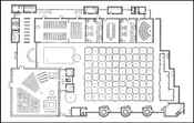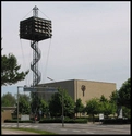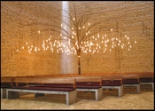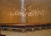 Belysningen over kirkegængerne er en kombination af dagslysstrejf og et messingtræ med armaturer anbragt for enden af hver gren.