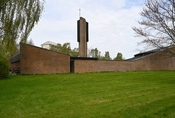Kirken er udformet som et stort cirkeludsnit på 120 grader med faldende tagflader der som en vifte breder sig ud fra centrum.