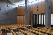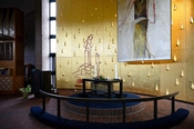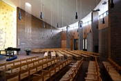 Kirkerummet domineres af den 13 meter høje buede altervæg, der på samme tid favner både prædikestol, døbefont og alter.