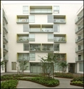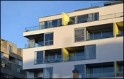 Facaden er lysende hvid og er et levende mønster af vandrette bånd af store, tilbagetrukne altaner, der skiftevis forskydes over hinanden.