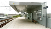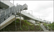 Perronbroen der betjener Køge Bugt Banen. Broens brystning, der er lavet af galvaniserede stålplader, følger broens krumning og bliver bukket ind under dækket og giver broen en helstøbt og solid fremtoning.
