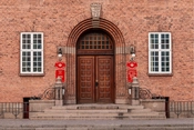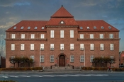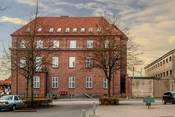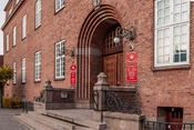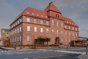 Domhuset i Albanigade er en 3-fløjet bygning, der omslutter den tidligere tinghusbygning fra 1861. Bygningen udstråler en tyngde og en strenghed, der ses i bygningens symmetri, i vinduernes helt regelmæssige placering og i indgangens udformning og placering midt i facaden mod Albanigade. Gesimsen mellem 1.sal og 2. sal bryder facadens massive udtryk.