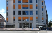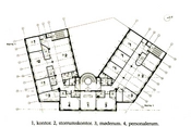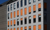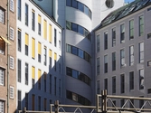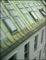 Kontorhusets sidefløje har kobberindækkede tagflader.