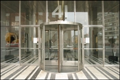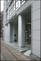 Indgangspartiet er ligesom søjlerne beklædt med rustfrit stål og i gulvbelægningen understreges partiet af marmor lagt i sorte og hvide bånd.