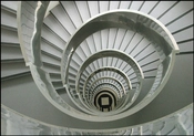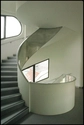 Den elegant svungne spindeltrappe med de maritimt formede vinduer.
