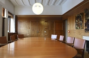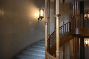 Trappetårnet har et maritimt præg – et træk, som også er gennemgående for bygningens indretning. Derudover er bygningens interiør præget af fine gørtlerarbejder i messing og bronze, smukke træskærer og snedkerarbejder og panelerne er i mange forskellige træsorter hentet hjem fra hele verden. I formandskontoret er de øverste vægpaneler lavet af et af Dyrehavens gamle egetræer, og underpanelerne er udført i afrikansk jambiré træ.