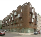 Boligejendommens unikke facadekomposition fortæller en moderne historie om variation og skulpturel form med afsæt i nabobygningernes rige detaljering. Facadernes brunrøde genbrugstegl og de modernistiske karnapper forbinder bygningen med kvarteret. Karnapperne klædt i kobber og glas skyder ud som øjne på facaden. Her kan beboerne træde ud og få et langt kig op og ned ad gaden, og de trækker samtidig lyset langt ind i lejligheden. Det svære murværk, der runder af og afslutter karreen, spænder i hele sin længde henover en let glasvæg, der beklæder den høje stueetage. Kontrasten mellem den tunge flade, der svæver over den lette, høje glasfacade, giver huset et strejf af modernitet og en uventet base.