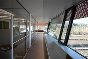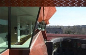 Facaden er tegnet som glasbaldakiner i en mørkerød tone, der ændrer sig over dagen, fra mørk til spejlende, så facadeflugten aldrig står ens hen over hele fladen.