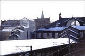 Indkøbscentret øst for stationen får meget fint fat i stationenens aftrapningsmotiv af tage over trapper til perroner.