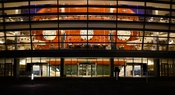 Indtryk af den dobbeltkrumme, varmt gule karakter af tilskuerrummet oplevet fra foyeren.