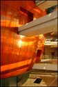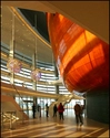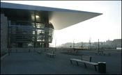 Hovedbygningen er beklædt med natursten, en glat overflade brudt af vinduesbånd og smalle lysspalter. I modsætning hertil giver den åbne foyers glasfacade de besøgende mulighed for at kigge indenfor fra havnen.