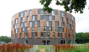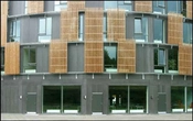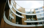 Den cirkulære gård er beklædt med olieret træ og vandrette tøndebånd i hvidmalet stål. Åbne balkoner i op til to etager ligger tilbagetrukket, som tilskuerpladeserne i et teater.