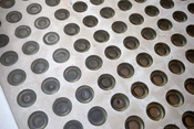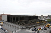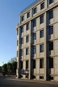 Indgangen markeres af en betonplade med navnet i relief. Facadens grønlandske marmorplader har vist sig problematiske og skal ofte udskiftes.